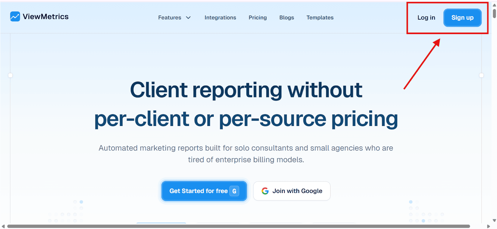 Start by heading to ViewMetrics and signing up with your email. If you already have an account, just log in to access your dashboard.