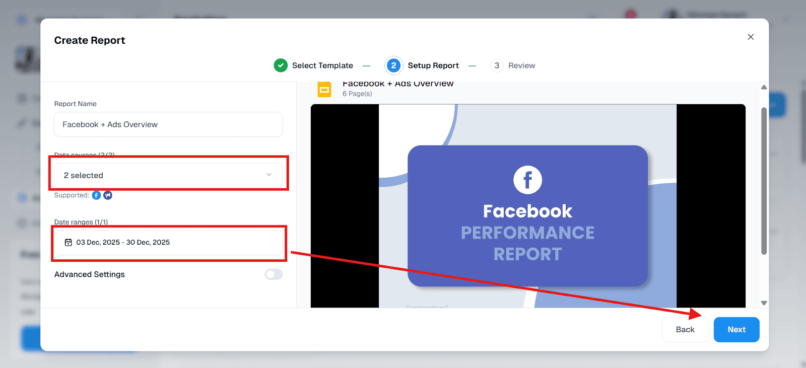 - From the available templates, choose Facebook Ads Report