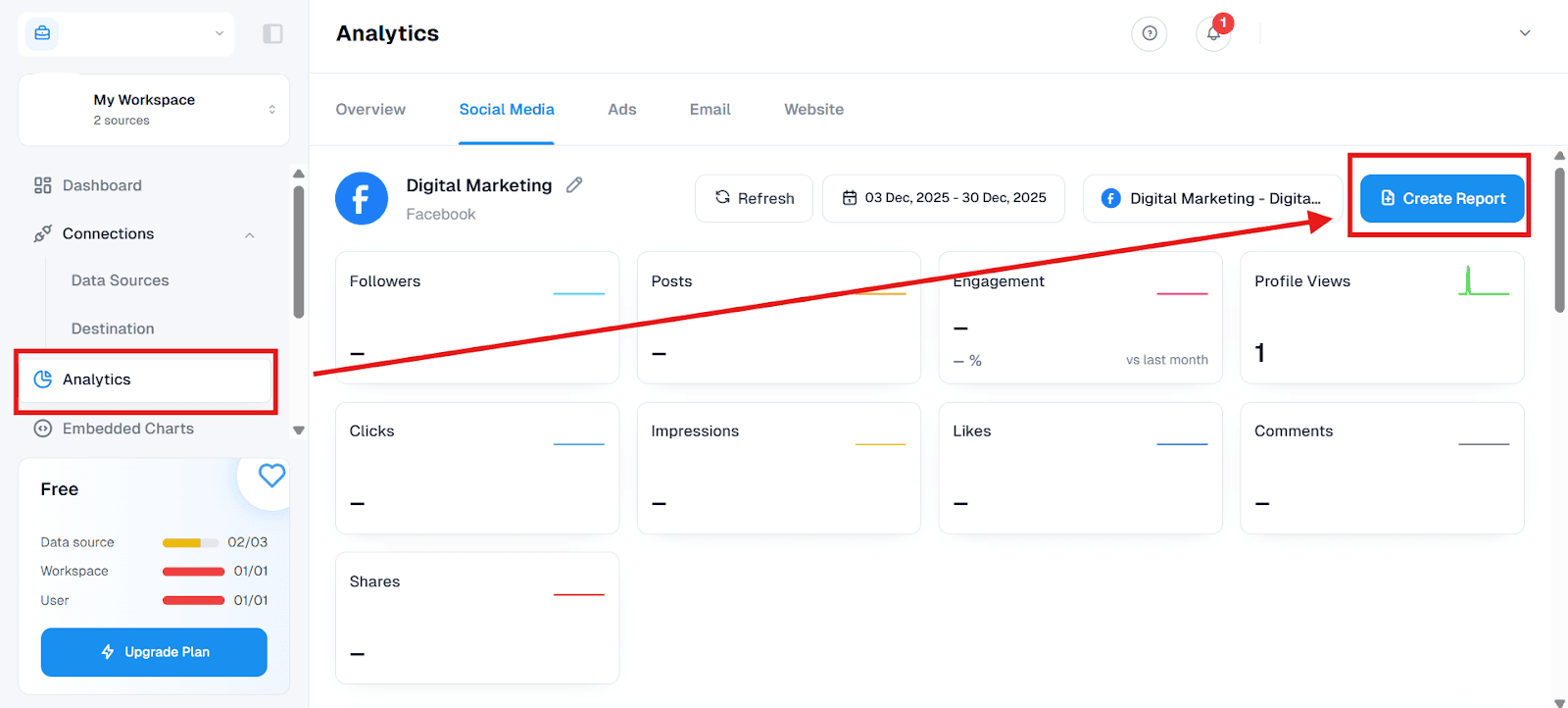 - Click “Connect Data Source” and select Facebook Ads