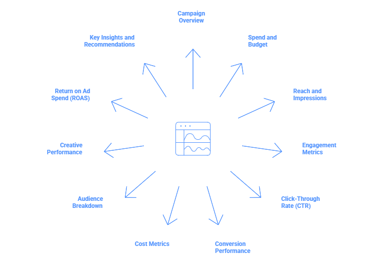 Include impressions, reach, clicks, CTR, conversions, CPA, total spend, and ROAS. Pick metrics based on your campaign goal, like awareness, leads, or sales.