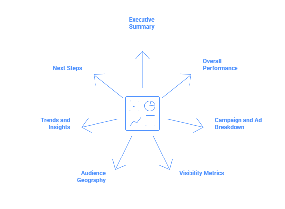 Start with a short overview. Tell your reader what the report is about in simple language. Mention the goal of your ads, how they performed, and whether results improved or dropped. Think of this as your quick elevator pitch that anyone can read and get the gist of your campaign’s status.