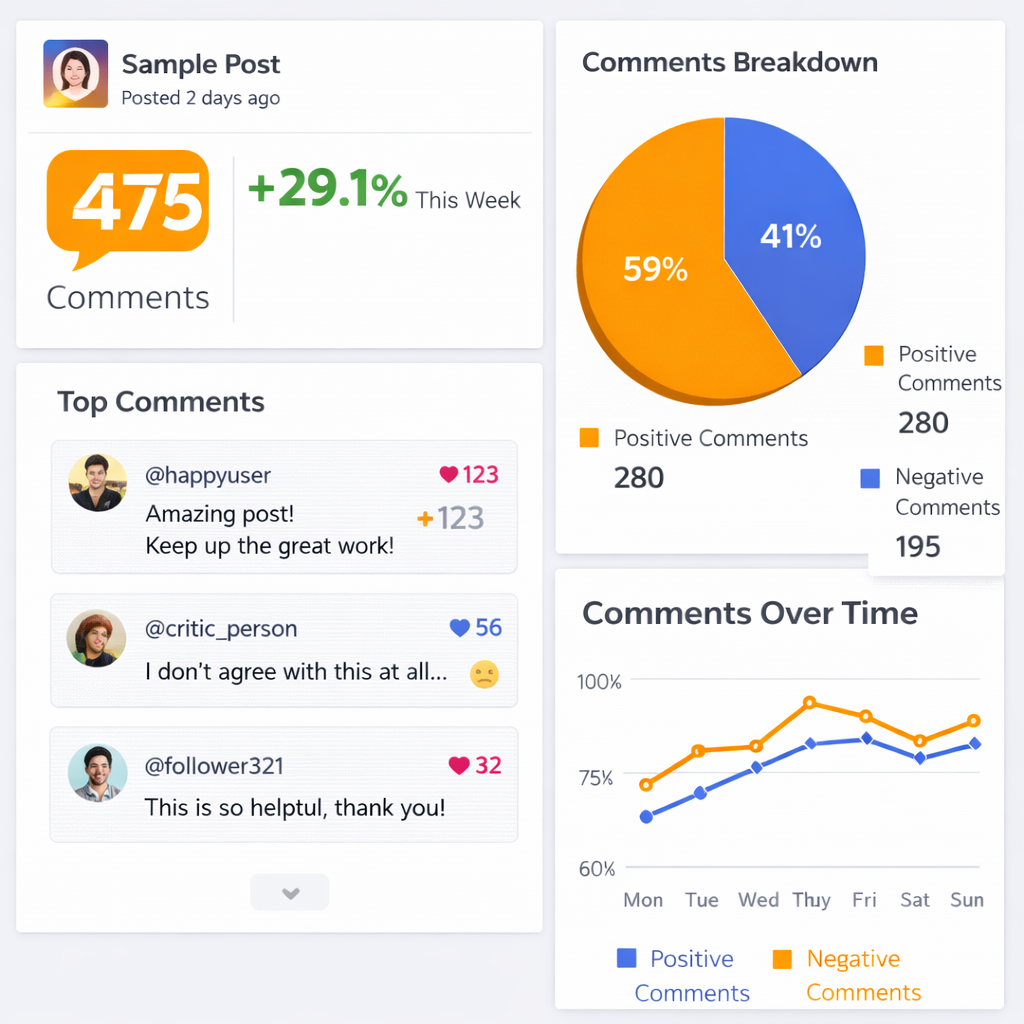 Comments are written responses that users add to your social media content. These can be directed at the original post or as replies to other comments. Users might also tag your account or others in their comments, encouraging a more interactive and engaging discussion around your content.