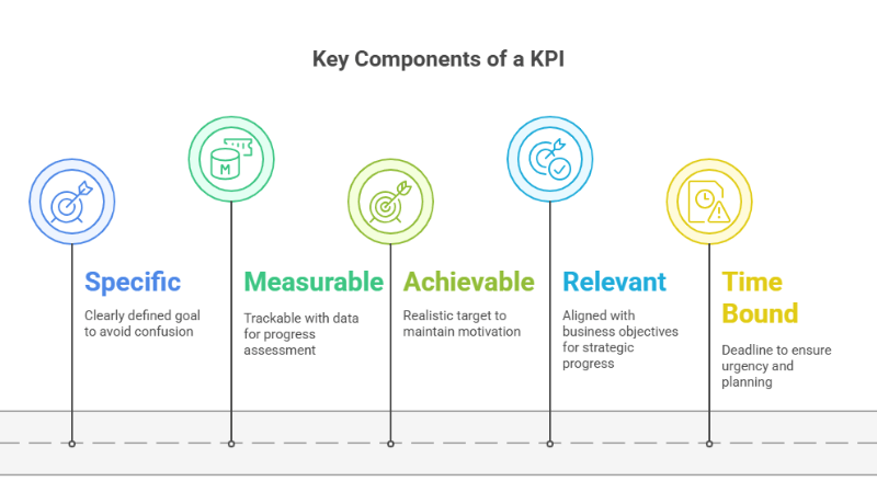 If you want a KPI to actually guide performance and track progress, it needs to be more than just a vague goal. A strong KPI is built on five important components that make it clear, useful, and measurable. Here’s what to keep in mind when you’re setting one up: